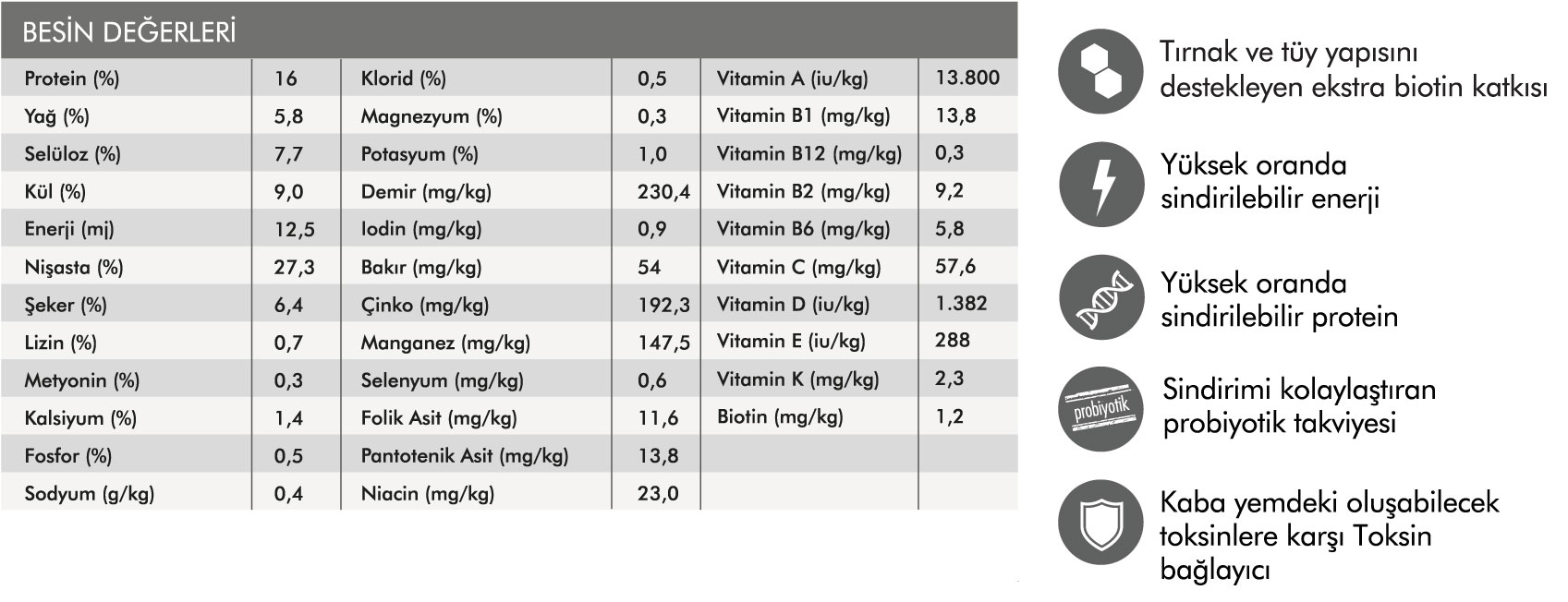 Mısır Flake, Arpa Flake, Ayçiçek tohumu küspesi, Soya küspesi, Şeker pancarı melası, Pirinç kepeği, Yulaf, Yonca peleti, Ayçiçek tohumu, Arpa, Pancar küspesi, Kalsiyum karbonat, Soya Yağı, Mısır, Vitamin Mineral Premiksi, Buğday, Tuz, Dikalsiyum Fosfat, Soya kabuğu, Mg. Oksit.